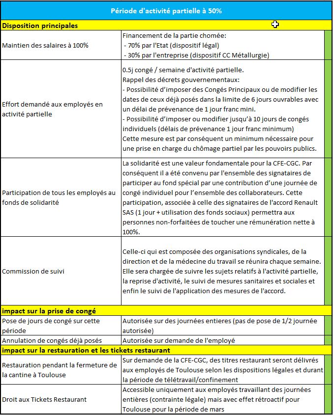 A ce titre, et conformément aux directives du gouvernement, le maintien par l’entreprise et l’Etat de nos salaires à 100% durant le chômage partiel se fera en échange d’uncontribution en jours de congés des employés. Celle-ci sera de 0.5 jours de congé (RTT/CET/CT/CP) par semaine de chômage partiel à 50%.